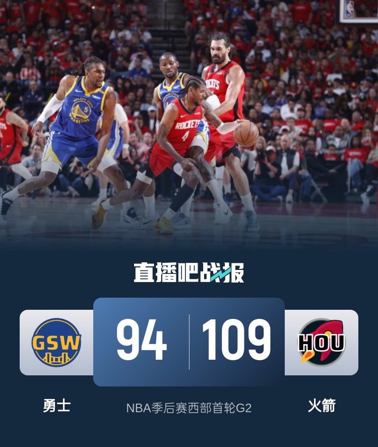 火箭(1-1):杰伦-格林38分4板6助3断、申京17分16板7助2断、狄龙16分3板1助、伊森14分6板1助、阿门11分1板3助、范弗里特7分6板2助3断、史密斯5分5板、亚当斯1分3板、霍勒迪1板1助、杰夫-格林1板、惠特摩尔1板。