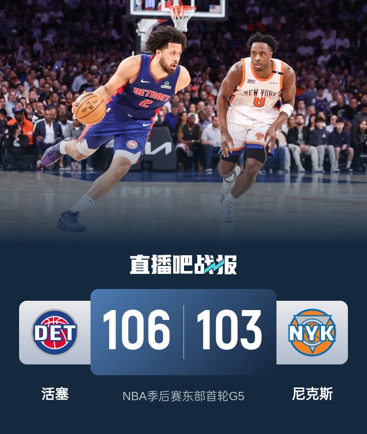 首节开局尼克斯面对自家熟悉的篮筐反倒找不到准心,前7分钟里他们仅得7分导致开局落入被动;不过后半段对手进入轮换成了他们的机会,尼克斯连续抢分并在最后时刻实现反超;次节双方开启拉锯几次互换领先,尼克斯方面核心布伦森半场7投1中但尼克斯仍然以1分优势结束上半场。休息归来活塞开局抢攻送上20-8的攻势一度拉开10分领先,但尼克斯又是抓对手末段轮换机会回敬9-0重新追上比分,这之后双方一路拉锯悬念留到最后,决胜时刻杜伦连续扣篮拿下关键分,康宁汉姆最后时刻一传一射为球队取得6分领先,尼克斯最后连续轰进三分但活塞最后时刻选择点球战术成功耗掉时间。最终,活塞力克尼克斯拒绝出局,目前总比分上2-3落后尼克斯。