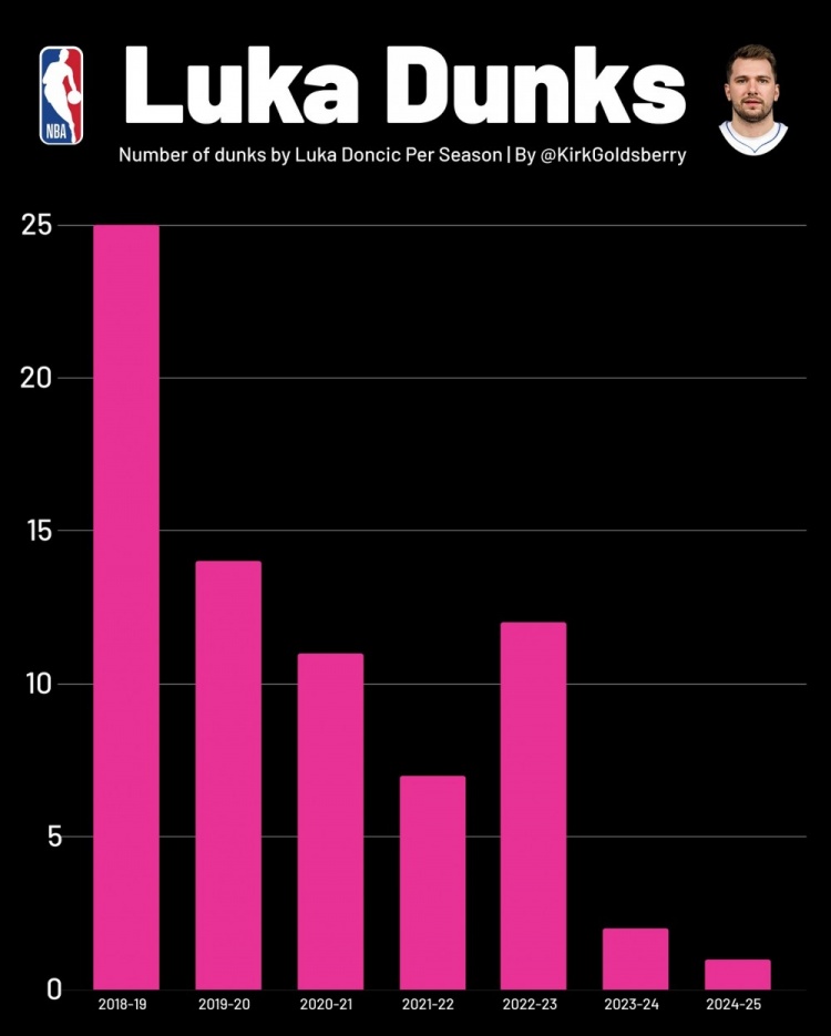据统计,东契奇新秀年曾有25次扣篮但之后每赛季从未超15次。
