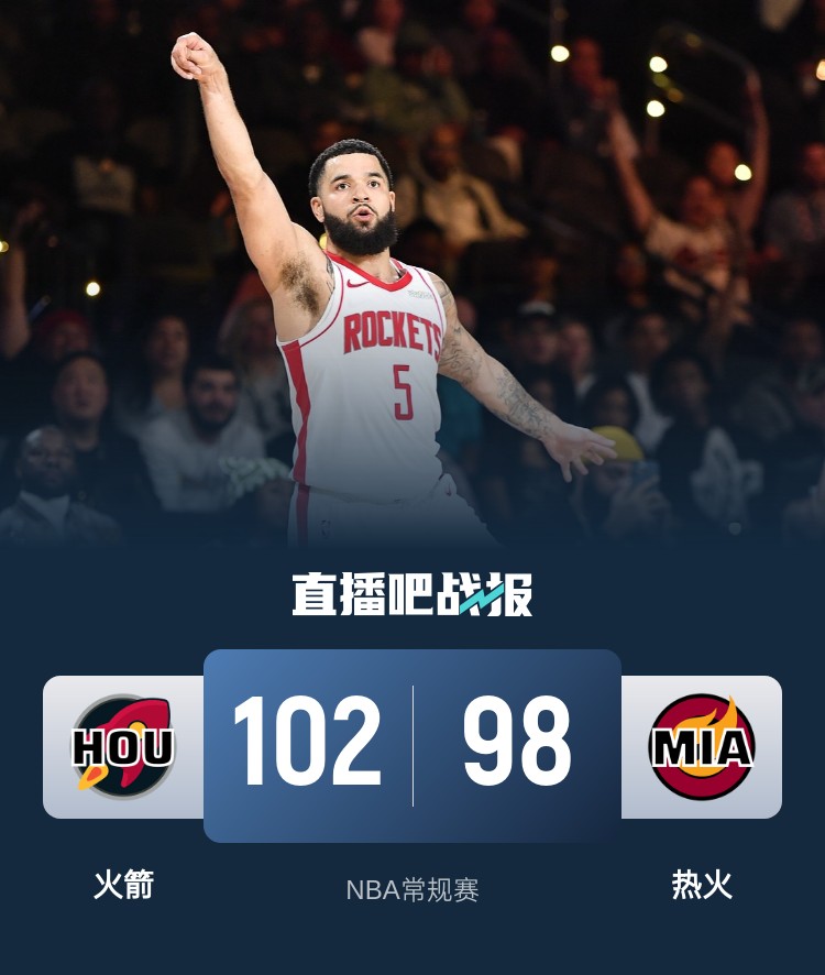 首节一上来双方互相试探,火箭多点开花一度占优,但热火内外结合迅速回应,首节结束时热火领先4分,次节回来,范弗里特连中三分率队反超,但维金斯突然爆发单节狂揽20分,热火回敬9-0小高潮夺回优势,半场战罢,热火已经领先8分。易边再战后热火进攻火力放缓,范弗里特手感滚烫独得12分,三节结束后火箭仅落后2分,末节决战,范弗里特依旧无人可挡,阿门续上火力,两人联手率队一举确立胜势,最终火箭102-98逆转对手豪取9连胜,同时终结对热火的9连败,而热火则遭遇10连败。