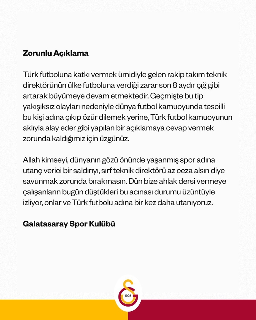 过去八个月来,某竞争对手主帅对我国足球造成的损害持续扩大且日益严重。此人此前类似的不当行为已引发国际足坛舆论谴责,然而我们遗憾地发现,其非但未致歉,反而以嘲弄土耳其足球届的方式作出回应,这迫使本俱乐部不得不公开表态。