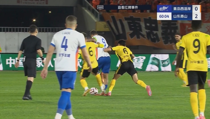 中超第7轮,青岛西海岸VS山东泰山,比赛第60分钟,青岛西海岸56号队员(高迪)脚部与山东泰山9号队员(克雷桑)腿部有接触,裁判员判青岛西海岸56号犯规,无纪律处罚。VAR介入后,裁判员经在场回看,向青岛西海岸56号出示黄牌。