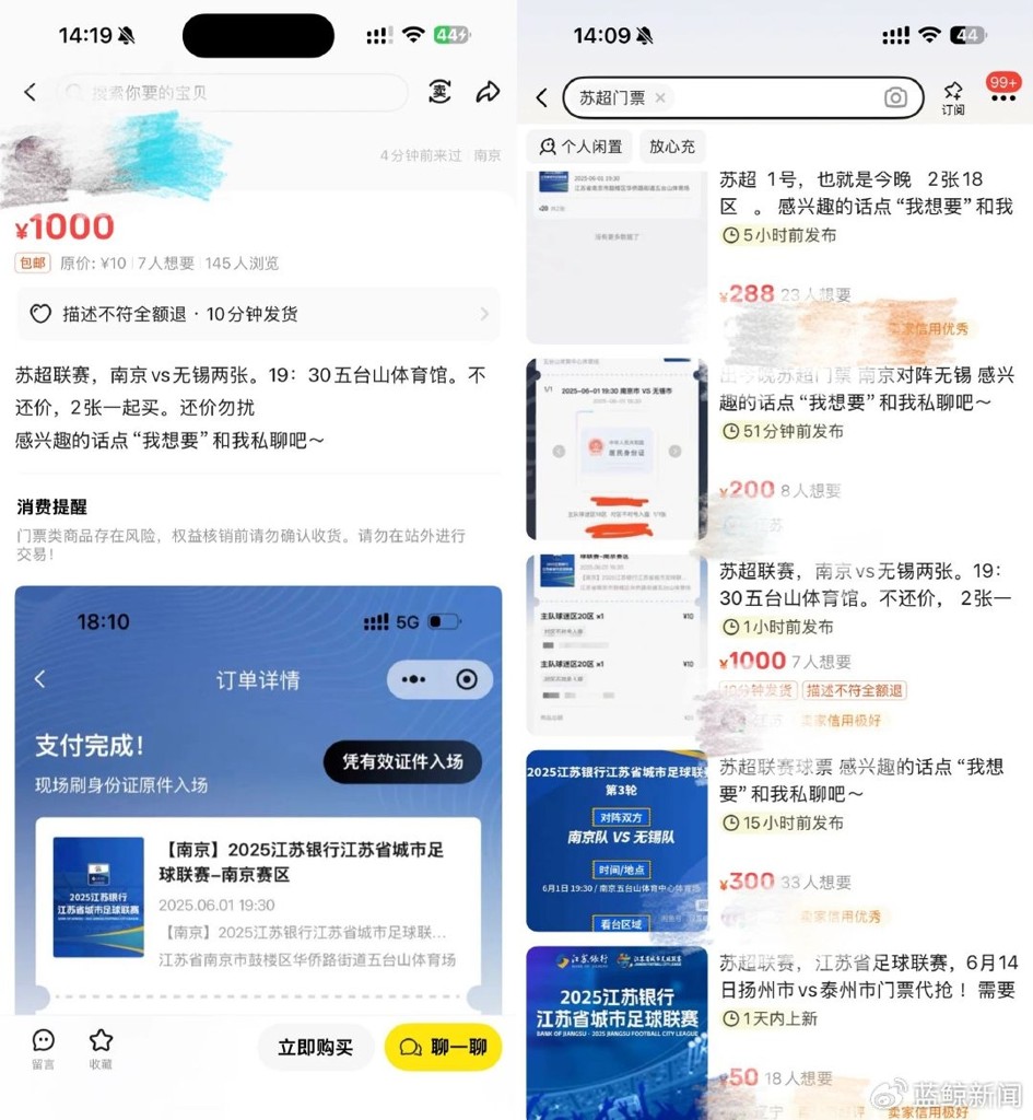 蓝鲸新闻:苏超10元门票最高炒到500,一票难求几乎场场售罄