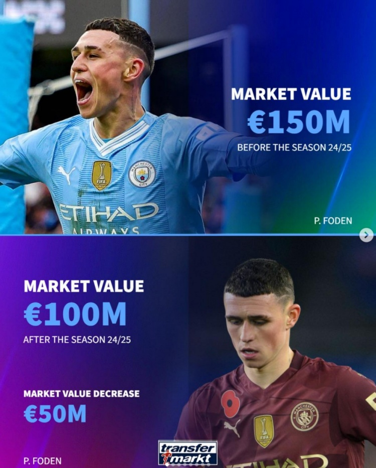 福登(曼城),现身价1亿欧,赛季前1.5亿欧,-5000万欧