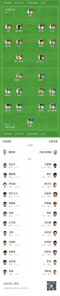 06月30日讯 今晚19:35中超第16轮,北京国安vs云南玉昆。赛前首发阵容已经公布。