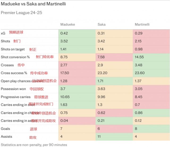 马杜埃凯、萨卡、马丁内利上赛季英超场均数据对比