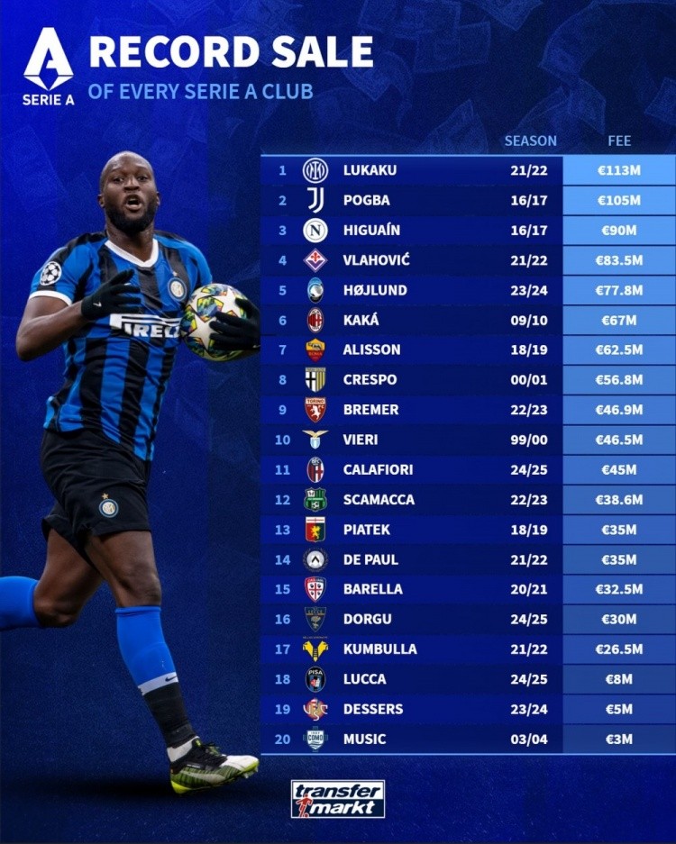 意甲各队最贵转出榜:国米1.13亿欧出售卢卡库居首,博格巴次席