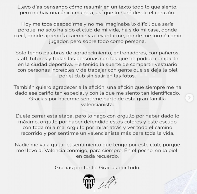 “结束这段旅程让我心痛,但我自豪地告别,因为我已经全力以赴,捍卫了这些颜色和队徽。回顾过去,我为走过的每一步感到自豪,并且我将永远是一名瓦伦西亚人。”