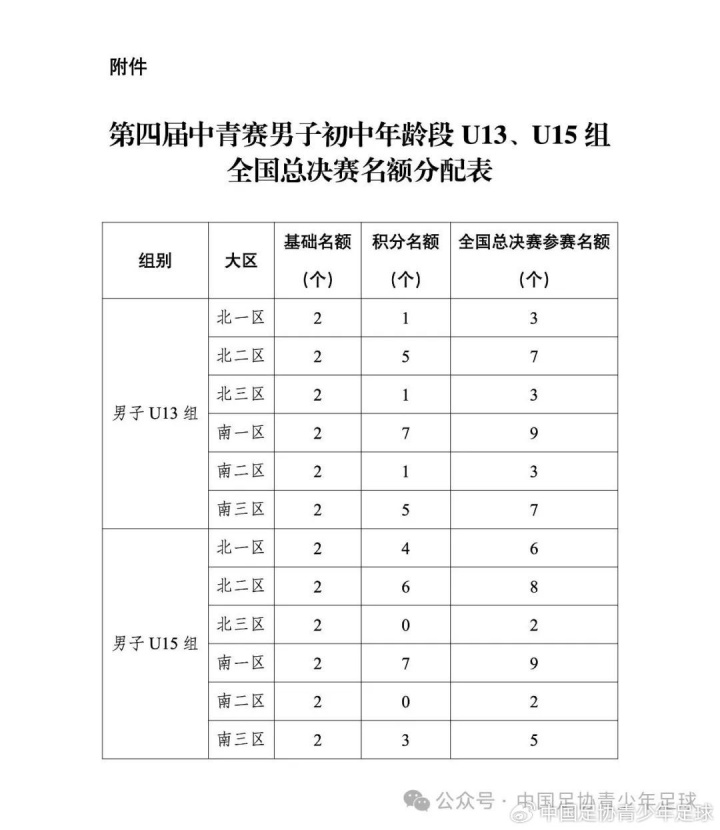 为落实《中国青少年足球联赛赛事组织工作方案》要求,做好2025年第四届中青赛男子初中年龄段U13、U15组全国总决赛赛事组织工作,结合各大区往届中青赛参赛情况,中青赛赛事办公室制定了《2025年第四届中青赛男子初中年龄段U13、U15组全国总决赛名额分配办法》(以下简称《办法》)。具体如下: