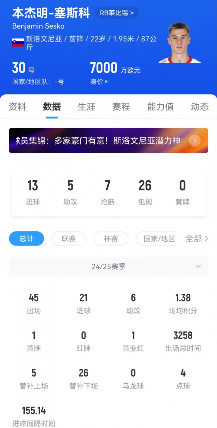 塞斯科现年22岁,上赛季为莱比锡出场45次,取得21粒进球和6次助攻,他与莱比锡现有的合同2029年到期,目前球员德转估值7000万欧。