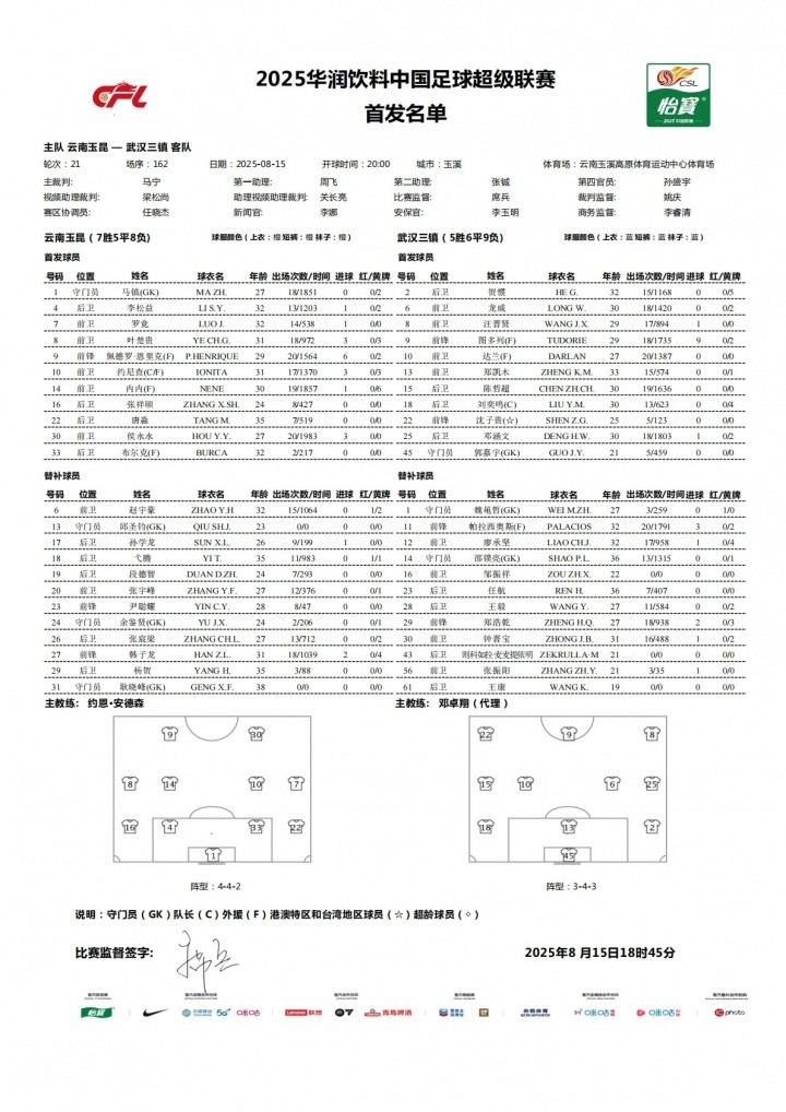 08月15日讯 今晚20点,中超第21轮 云南玉昆vs武汉三镇。赛前首发阵容已经公布。