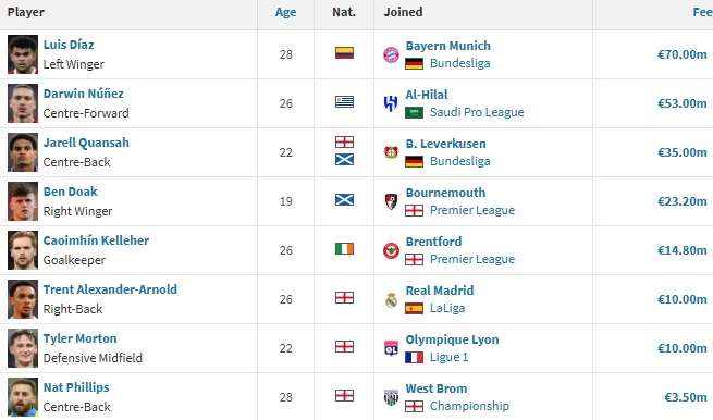 利物浦今夏球员出售情况(总计约2.195亿欧,不算浮动)↓