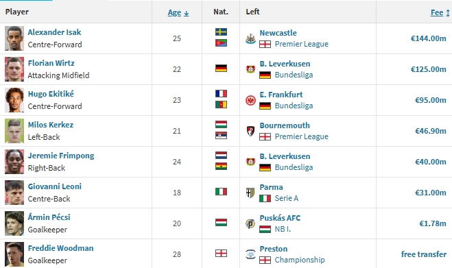 自此,利物浦今夏已经卖掉了8名球员,共收入约2.195亿欧。在签下伊萨克后,利物浦目前在引援方面共花费4.8368亿欧。