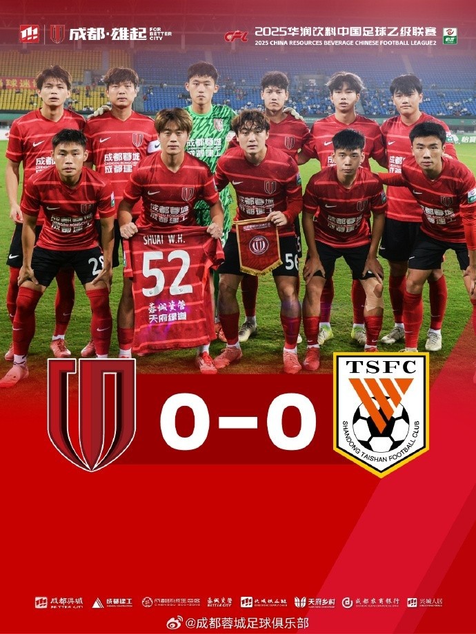 9月27日19:30,2025华润饮料中乙联赛第27轮(决赛阶段第5轮),成都蓉城B队主场迎战山东泰山B队。上半场,双方球员攻防节奏极快,拼抢异常激烈,但均未能打破场上僵局。下半场,两队攻势不减,第53分钟,陈斯亮的头球击中了横梁,错失改写比分的绝佳机会。随后双方虽持续向对手球门施压,频频制造威胁攻势,但均未能把握住破门良机。最终,成都蓉城B队0-0山东泰山B队。