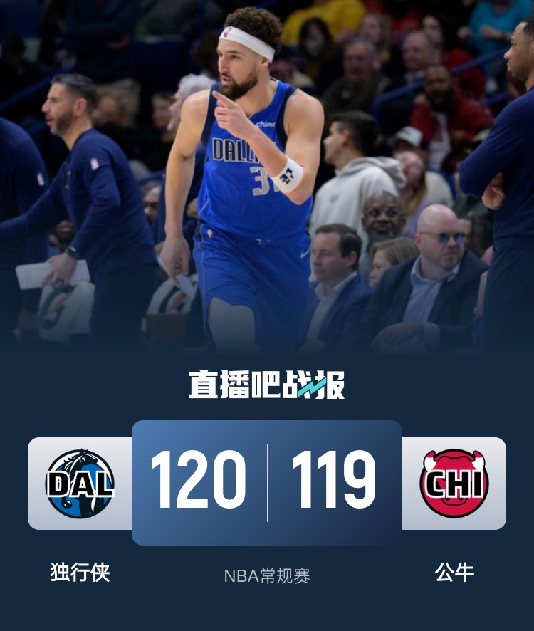 首节开打后公牛延续近期出色状态,怀特和武切维奇轮番杀伤,布泽利斯续上火力,华盛顿早早发力及时止血,首节结束时公牛领先4分,次节回来,公牛一度确立两位数优势,克莱连中三分率队回敬15-0攻击波,半场战罢,独行侠反超3分。短暂休整后双方陷入缠斗,独行侠多点开花守住优势,三节结束后独行侠依然领先2分,末节决战,独行侠全员发力拉开比分,公牛连中三分紧咬比分,决胜时刻独行侠提前犯规,克莱两罚全中后公牛追分未果,最终独行侠120-119险胜对手。