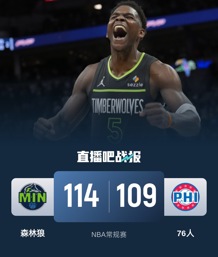 比赛上来,森林狼面对残阵的对手并没有上太大防守强度,76人能够一直与对手保持拉锯,爱德华兹期间奉献一记精彩隔人暴扣,次节森林狼迅速将分差拉开到两位数,但76人显然不会轻易放弃,朗尼-沃克和亚布塞莱两人联手帮助球队咬住比分,半场结束时森林狼仅领先4分;下半场回来,森林狼的防守强度依旧没有提升,而76人已经越打越好,他们反超比分后与对手交替领先,末节76人在87-85领先后直接断电不得分,森林狼一波12-0直接拉开分差,格莱姆斯虽然连中三分续命但还是未能逆转,爱德华兹连中三分给出回应,最后的神奇压哨三分更是直接杀死比赛,最终森林狼力克76人,迎来5连胜的同时也送给后者11连败。